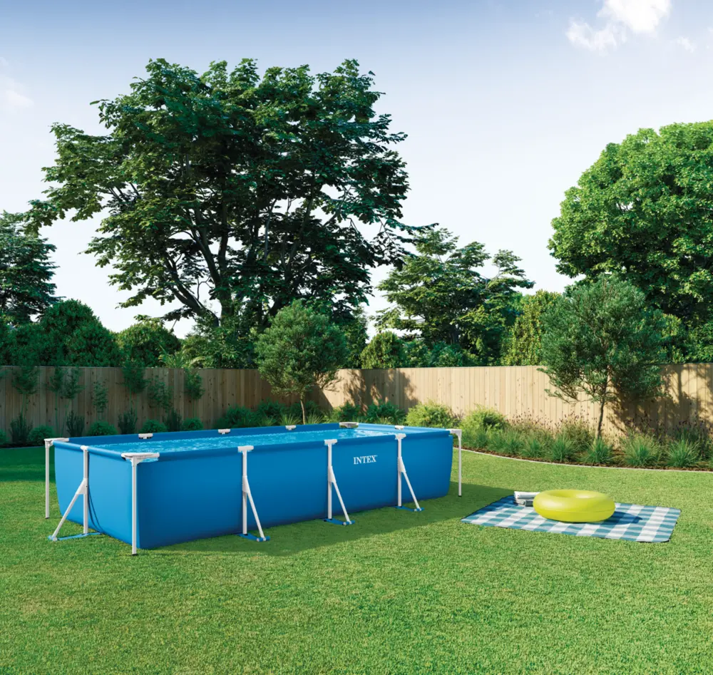 Intex FRAME POOL pravokoten bazen iz standardne serije. Izdelani so iz 3-slojnega SuperTough™ material. Pravokotni bazen z okvirjem je idealen za družinsko vrtno zabavo.